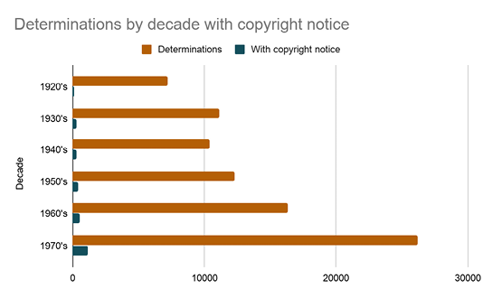 Over 101,000 volumes were public domain in the United States because they were published without copyright notice. About 18,000 volumes had to remain closed, of these only 3,258 volumes were tagged by reviewers as having copyright notice. Publication with copyright notice holds different significance based on the date. Between 1964 and 1977, renewal was no longer a required formality so the works published during those dates would be in copyright, which for us was a subset of just 1,537. Before 1964, publications with notice could yet be public domain if the copyright was not renewed with the US Copyright Office. We chose not to do the additional research into renewals because of workflow considerations.