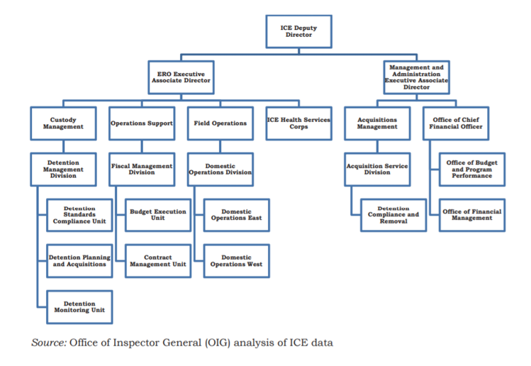 Though the Office of the Inspector General (OIG) took differences in standards into account when assessing ICE’s performance accountability measures in 2019, the report still found the agency neglected their responsibility to hold facility contractors accountable for failing to meet performance standards. The OIG review focused on the 106 private facilities whose contractors were the recipients of $3 billion since FY 2016.52 As illustrated in figure 2, ICE relies on a multilayered system to oversee contract management and facility operations.