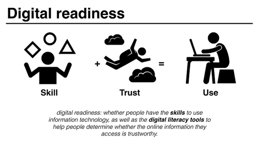 The Pew Center for Internet and Society, one of the few larger non-academic organizations continuing to do research into the digital divide, has been talking about digital literacy and the corresponding digital readiness gap. Whereas the digital divide used to refer to a lack of actual computers or sufficient broadband, now we’re seeing more people struggling with their inability to engage in self-directed learning online, while gaps in technology and broadband access still remain.