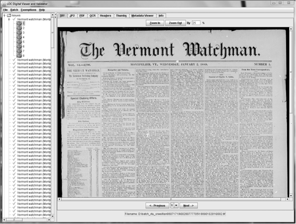 LC provides the most essential tool, the NDNP or DVV,61 which is used to examine the OCR files and to check that the image headers are correct. The DVV orders the information in a manner that allows one to check OCR zoning and for correct bibliographic information. The critical function of the DVV is to validate and verify the digital signatures of the files in a batch. Validation checks to ensure that the batch data meets the structure of NDNP technical specifications, though not the specific information within that structure. Digital signatures are then written into the batch. The presence of these digital signature files provides a ready way to quickly see that a batch has been validated. Verification is a similar process that checks the data structures, but it does not write files to the batch. Whenever data are moved, either virtually or physically, verification is used to ensure that no damage or errors occurred in transfer.