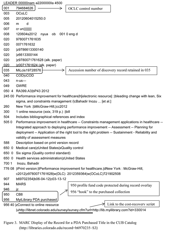 Figure 3 MARC Display of the Record for a PDA Purchased Title in the CUB Catalog (http://libraries.colorado.edu/record=b6970235∼S3) |