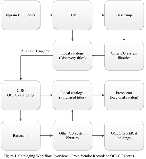 The University of Colorado (CU) system represents a diverse group of institutions composed of three universities operating on four distinct campuses with five separately administered libraries. The libraries are located at the University of Colorado Boulder (CUB), University of Colorado Colorado Springs (UCCS), University of Colorado Denver (UCD), University of Colorado Anschutz Medical Campus (a component of UCD), and the University of Colorado School of Law (a component of CUB located on the CUB campus). CUB is the CU system’s flagship institution. The diversity of the campuses and programs served by the CU libraries is reflected in their respective budgets and in the operational structures they developed to meet the needs of their patrons with the resources available to them. Currently each library uses Innovative Interfaces’s integrated library system (ILS), and all five participate in Prospector, a unified catalog of over forty academic, public and special libraries in Colorado and Wyoming, sponsored by the Colorado Alliance of Research Libraries. However, while CUB uses Ingram Academic, formerly Coutts Information Services, as its major vendor for monographic purchases, a variety of other vendors supply print and electronic monographs to the CU system libraries, including unique vendor arrangements for each library. Furthermore, the cataloging or metadata units of the CU system libraries vary widely in terms of staff size and specialization. For example, CUB Libraries has a relatively large metadata services department with highly specialized experts. At the other end of the spectrum is UCCS with only one professional cataloger who handles materials in all formats.
