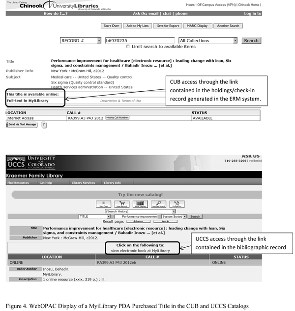 Figure 4 WebOPAC Display of a MyLibrary PDA Purchased Title in the CUB and UCCS Catalogs |
