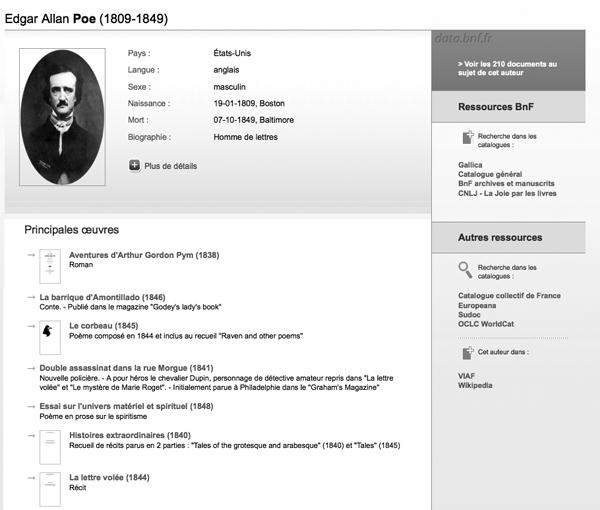 As an example, figure 2 shows the beginning of the entry for Edgar Allen Poe as of February 2012. Certain elements in the display are generated automatically and can vary with time. By selecting “Liste des auteurs” and “P” in the alphabetical display, a user may browse to the entry for Poe. The entry begins with brief biographical information and a portrait. Beneath the author’s entry is a list of Poe’s major works and then a list of all of his works broken down by field of activity (e.g., author, librettist, etc.). To the right are listed additional resources at the BnF itself (Gallica, Catalogue général, BnF archives et manuscrits, Centre national de la literature pour la jeunesse), other resources on the web (Catalogue collectif de France, Europeana, Sudoc, OCLC), and other sources of biographical information (Virtual International Authority File (VIAF), Wikipedia).