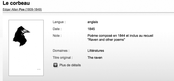 Returning to Poe’s page (figure 2), 637 entries follow his name. They include, as one would expect, editions and translation of his works. Also included in the list are musical settings of his works by such composers as Darius Milhaud (Les Cloches), a facsimile of the autographed manuscript of Tales and Songs from the Bible of Hell by Henri Pousseur, and works based on Poe’s stories such as the unfinished opera La Chute de la maison Usher by Debussy and a horror movie Le Vampire et le sang des vierges based on The Pit and the Pendulum. A tremendous amount of information concerning Poe, his works, and how they have been used and adapted has been pulled together from various silos of information and brought together for the first time.