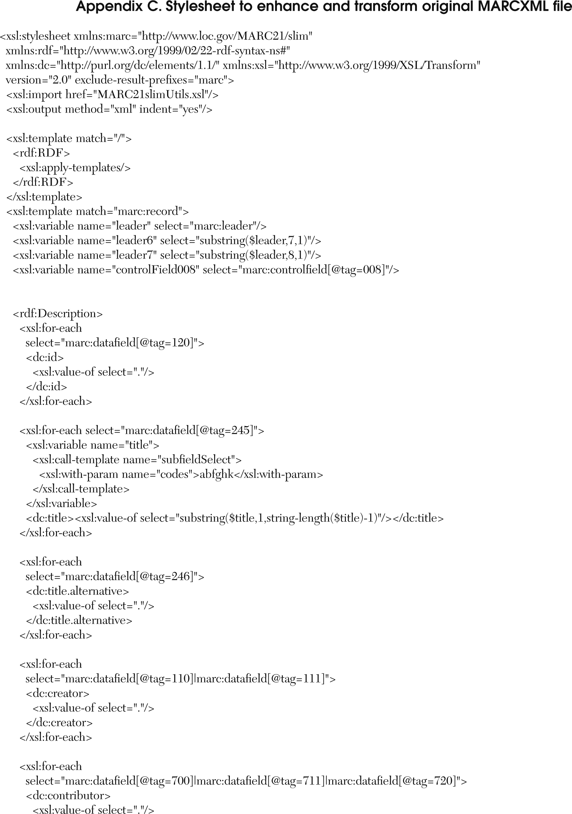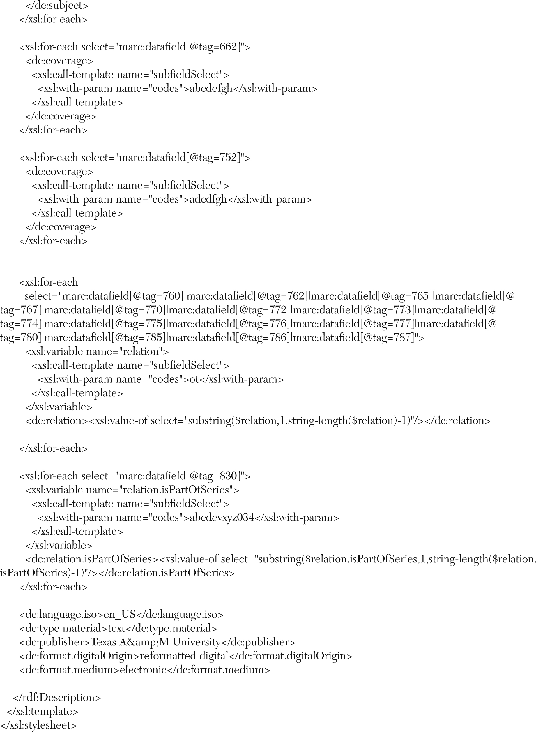 Catalogers at Texas A&M University Libraries used the stylesheets available on LC’s Network Development and MARC Standards Office site for the second experiment. As stated on the LC site, “this framework is intended to be flexible and extensible to allow users to work with MARC data in ways specific to their needs. The framework itself includes many components such as schemas, stylesheets, and software tools.”36 For the purpose of data transformation for sample records from MARCXML to DC, the authors adapted the LC MARCXML to Resource Description Framework (RDF) Encoded Simple DC Stylesheet. The use of this stylesheet produced the DC-RDF file format.
