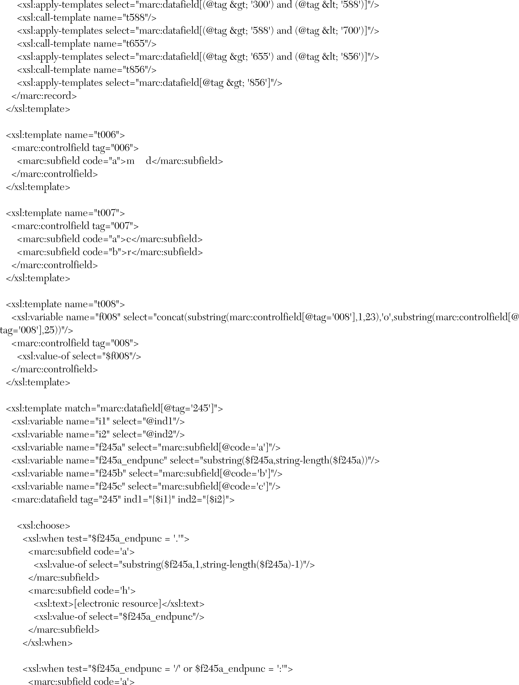 The XSLT for this experiment was created by one of the three authors. As libraries frequently purchase electronic versions of resources owned in print, the authors believed it would save time and money to create MARC records for the electronic resources by reusing the existing metadata stored in the bibliographic records for the print versions. Using a simple XML editor, they created a stylesheet to transform bibliographic records for the print resources to bibliographic records for electronic version of same resources in MARCXML file format (see appendix A). The bibliographic records in MARCXML were transformed through the MarcEdit utility into MARC records ready for import into the local Integrated Library System (ILS).