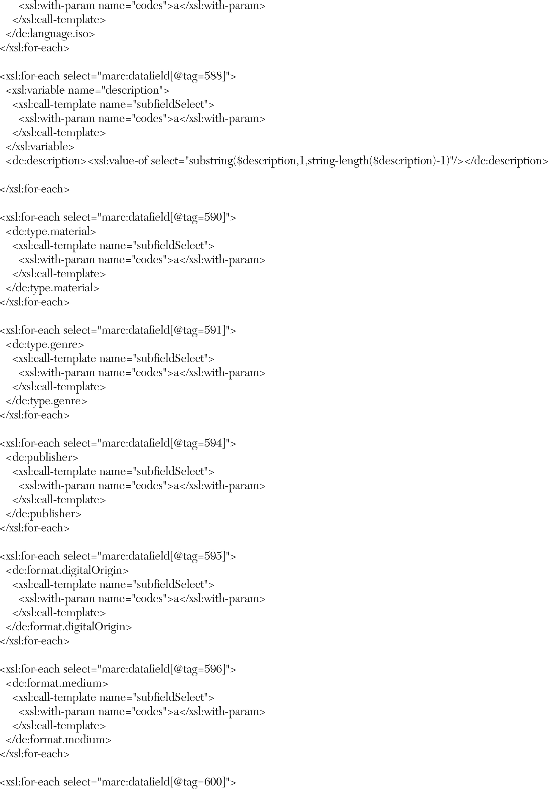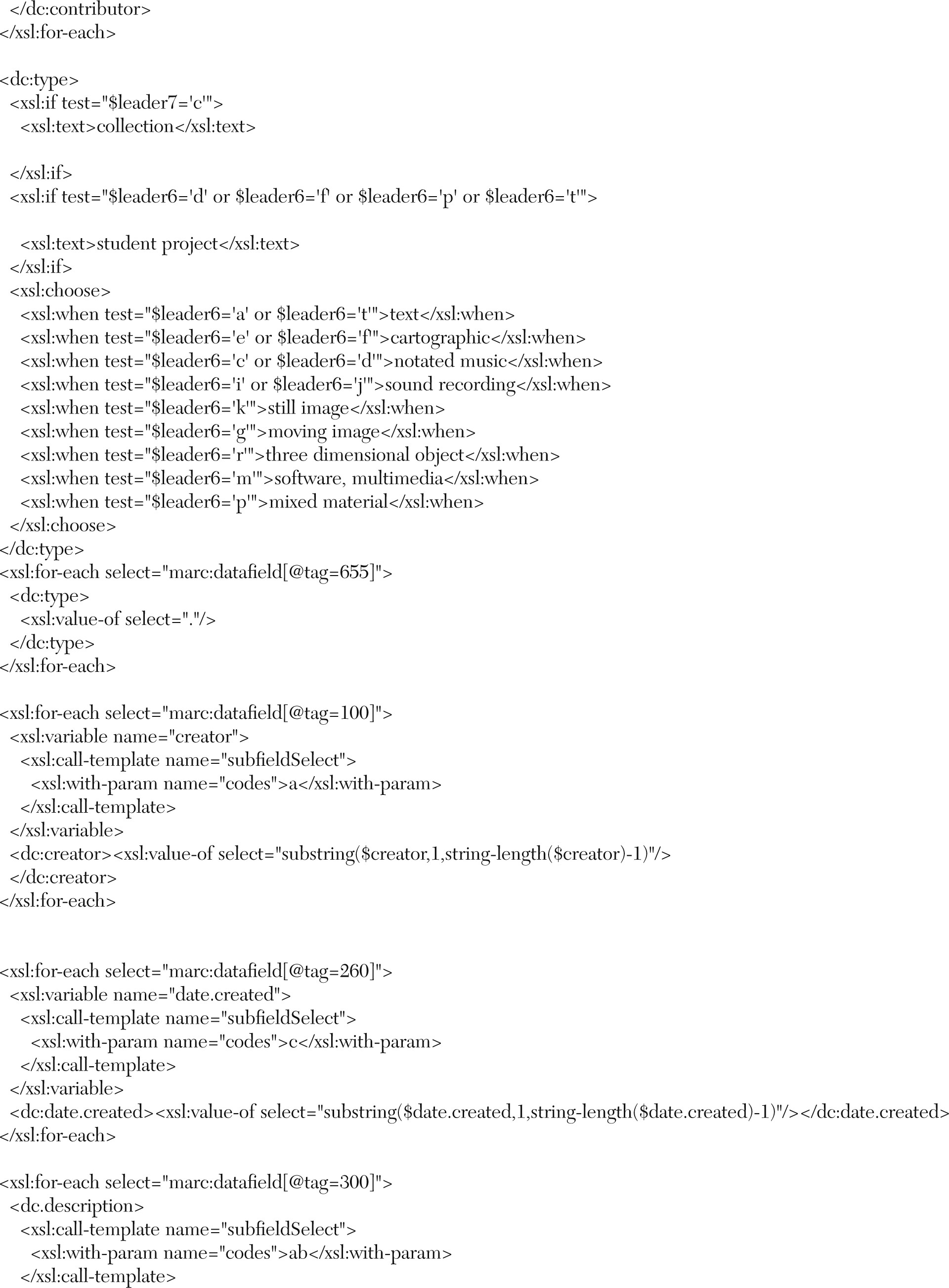 Each collection had specific requirements, and to meet those requirements and preserve and transform metadata from MARC to DC, the authors tailored stylesheets for each collection. They first created a collection profile to match the local DSpace DC metadata matrix. The next step was the addition of fields that would be the same for every item in a collection. These additional global fields included the following: dc:format.digitalOrigin, dc:format.medium, dc:type.material, dc:type, and dc:language. According to Hillmann, the recommended best practice for the values of the Language element is defined by RFC 3066 which, in conjunction with ISO 639, defines two and three letter primary language tags with optional subtags (see table 1).37 The authors used the following form: en-US.