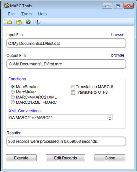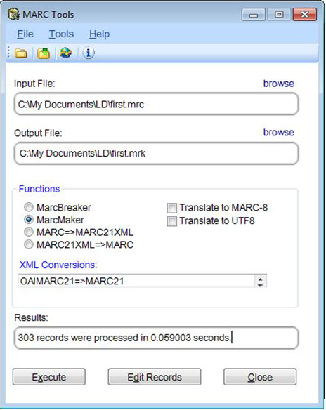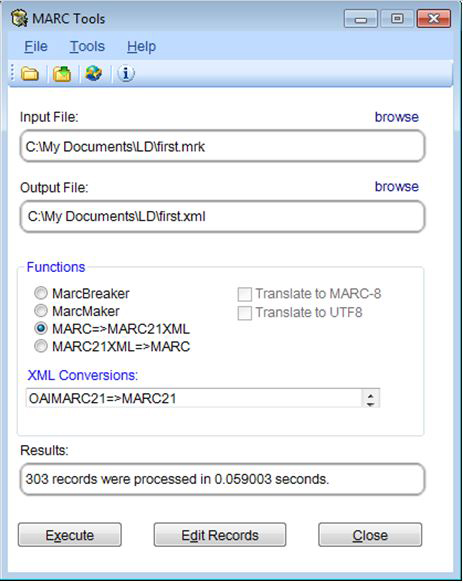 After preparing the MARC files, MarcEdit was used to convert the files into MARCXML documents. The first step was to convert the downloaded OCLC file to MRC file format using the “MarcBreaker” function (see figure 2). The second step created the MARC file in MRK file format with the “MarcMaker” function (see figure 3). The final MarcEdit step was the transformation of the MRK file into XML format with the “MARC=>MARC21XML” function (see figure 4). Once the files were in XML format, the authors experimented with them by applying different stylesheets and transforming them from MARCXML to DC XML files. They used Oxygen software for processing and transforming the metadata.