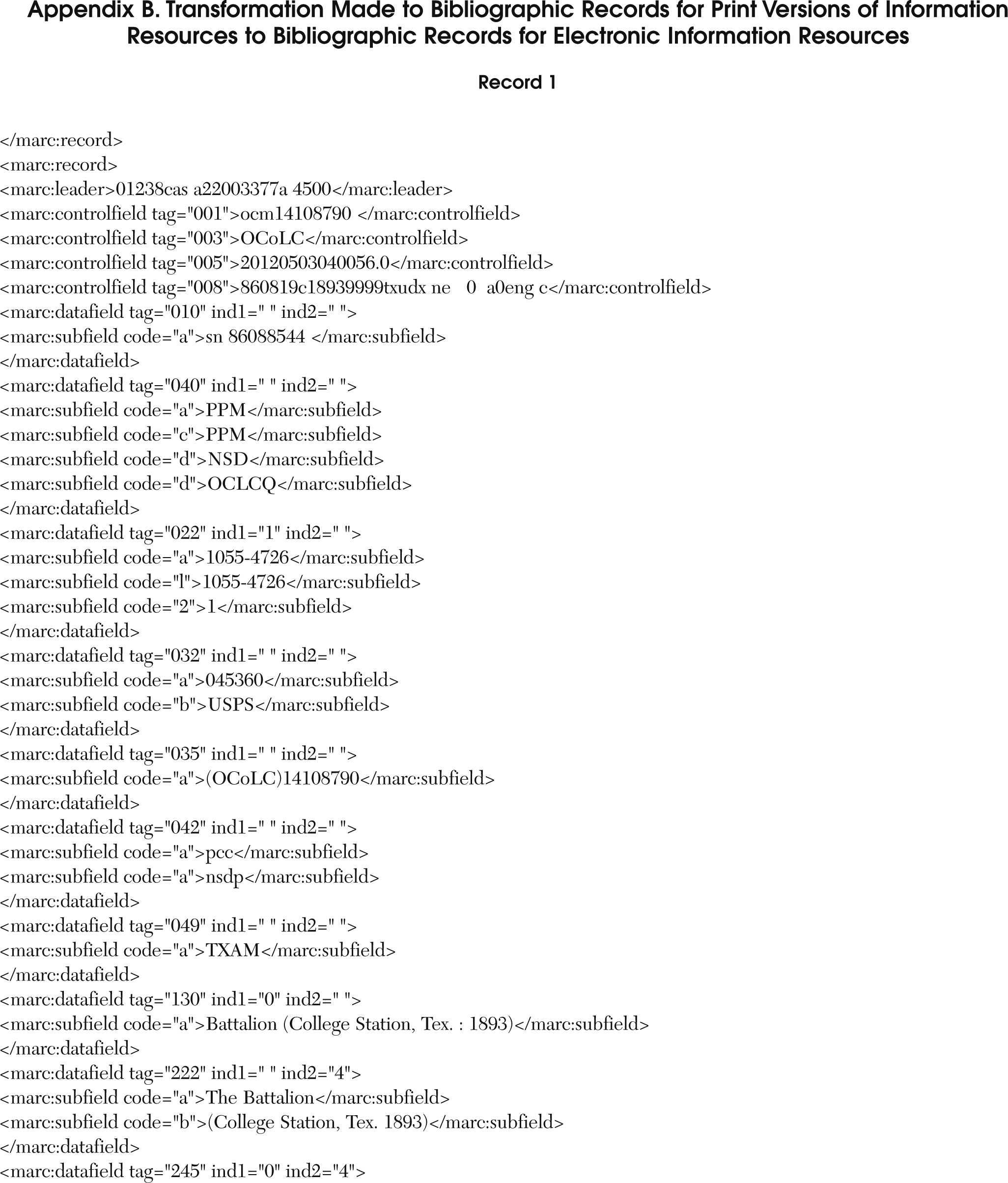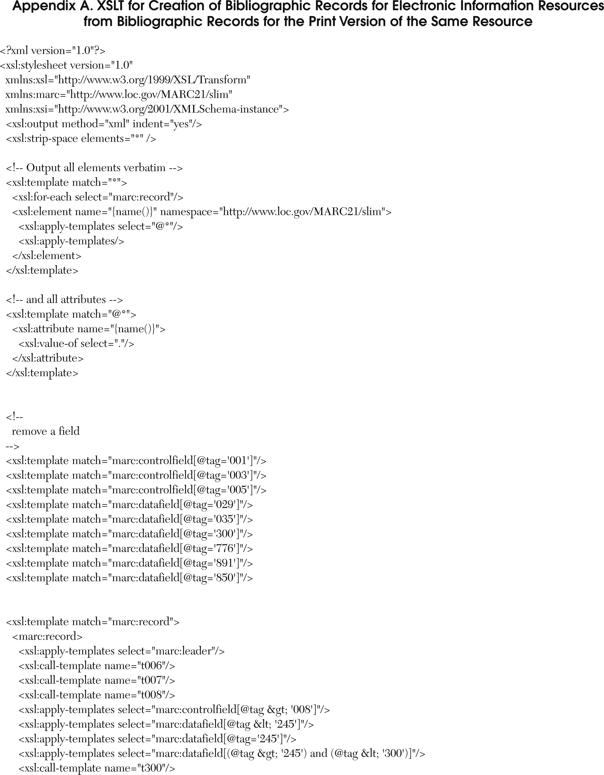 The transformation made to the bibliographic records for print versions of information resources to bibliographic records for electronic information resources is shown in appendix B. There are two examples of bibliographic records in appendix B: one for a print information resource (record 1) and one for an electronic information resource (record 2). The changes made to the bibliographic records for print resources are made using the stylesheet referred to in appendix A.