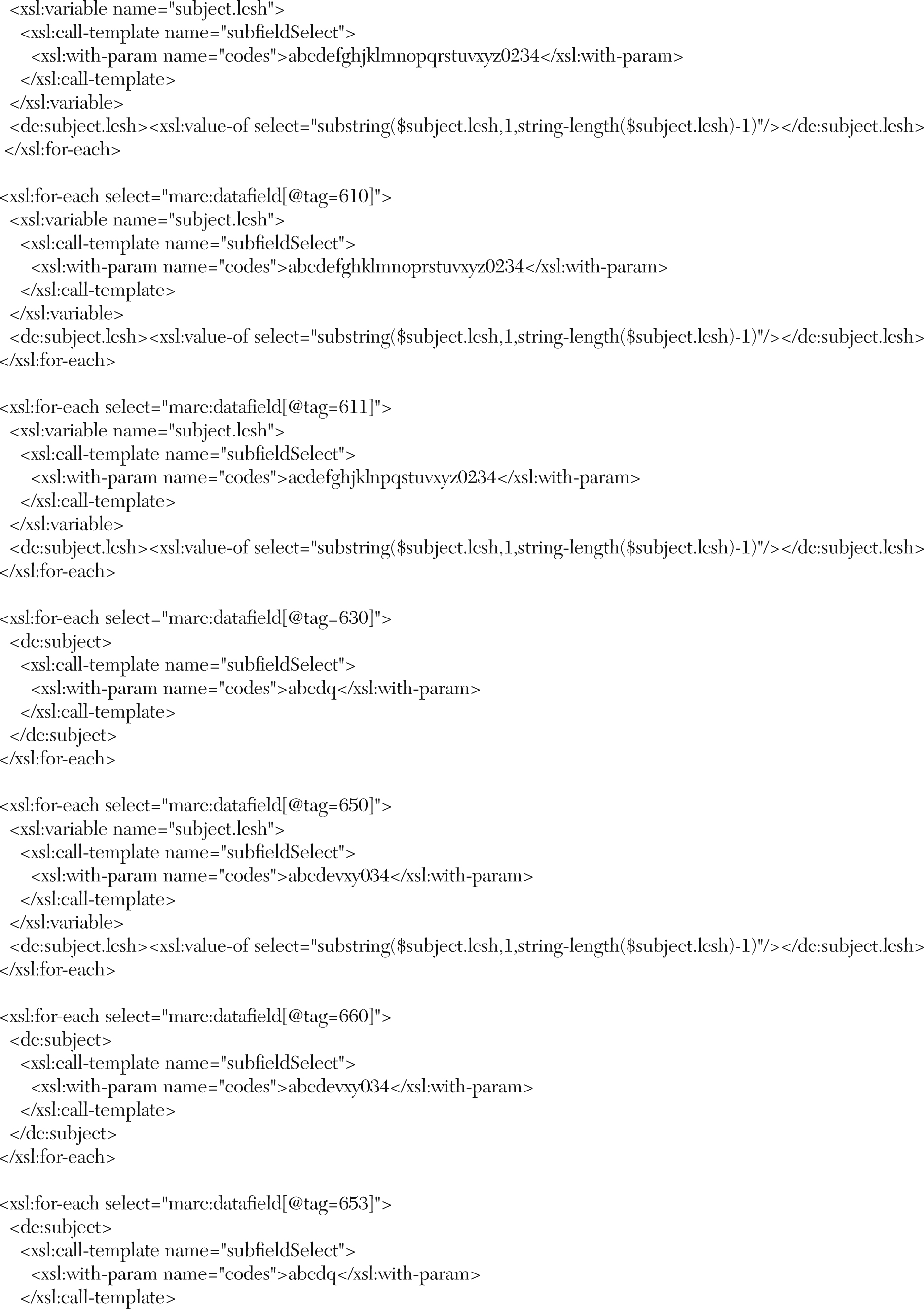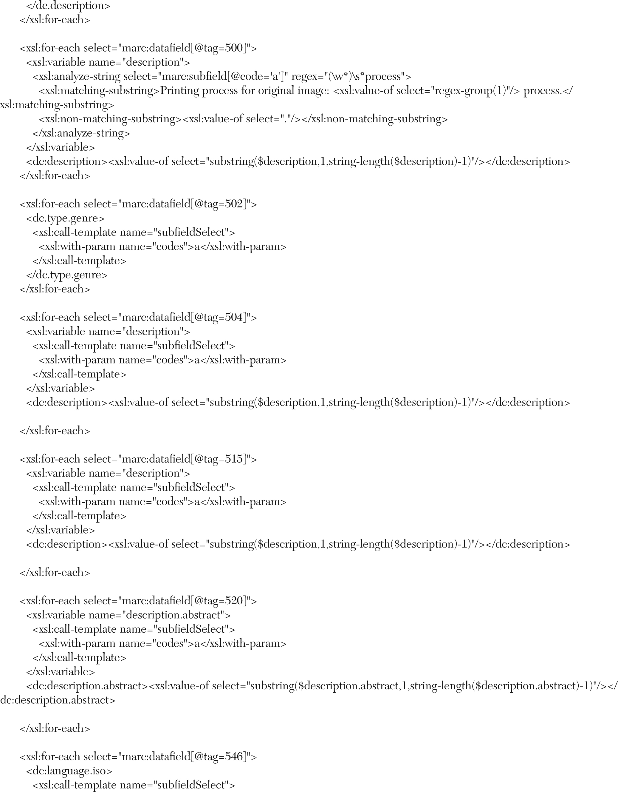 The issue with crosswalking metadata from a schema with high granularity such as MARC to a less granular schema like DC is that the loss of bibliographic content and context is unavoidable. Reese notes that metadata of lower granularity cannot easily be moved to schemas with higher granularity because content and context cannot be manufactured if they are not present in the original record.38 For this reason, the authors added fields to the MARCXML file that are equivalent across the whole collection by applying a transformation scenario through XSLT. Examples of added fields are the language field, the MARC 590 field with value “text” mapped to dc:type.material, or the MARC 591 field with a value “reformatted digital” mapped to datafield dc:format.digitalOrigin. This solution may not be perfect, but it was accomplished easily by using a stylesheet customized for each collection set. Careful analysis of content before the construction of a stylesheet for a collection enabled identification of fields that would be appropriate for all records. The number of addition global fields across a collection varied; up to ten were added for some collection sets.