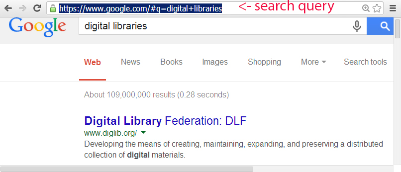 People engage in searches to satisfy their information needs. Searching is one of the two major types of interactions between users and discovery and access systems such as library catalogs, databases, search engines, or digital libraries.13 User searching is expressed through queries: sets of one or more symbols (e.g., words or phrases) combined with other syntax and used as commands for the information retrieval system to locate potentially relevant content indexed by that system. The query is a key theoretical construct in both the information-retrieval systems research and the information searching behavior research fields.14Figure 1 displays an example of a search query for “digital libraries” in one of the major search engines.