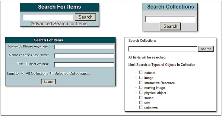 Figure 2 displays search options that were enabled in the OH large-scale digital library at the time of this study. There were two types of item-level search where the user searches for individual information objects. The basic version of search for items allowed searching by keyword or phrase anywhere in item-level metadata records that describe individual items. The advanced version of search for items allowed searching by keyword or phrase anywhere in item-level metadata records, the faceted searching (i.e., a search in specific field(s) of the metadata record) by author/artist’s last name and/or by title/subject word(s), with a possibility to combine search fields and to limit results to specific digital collections selected from the dropdown menu. OH also thoughtfully provided its users with two collection-level search options to accommodate users interested in finding entire collections as opposed to individual items. The basic version of search collections allowed for a simple keyword search in all fields in collection-level metadata records that describe the collection of items as whole as opposed to individual items. The advanced version of search collections option augmented a simple keyword search in all fields in collection-level metadata records with a possibility to limit search results to collections containing one or more of eight resource types: dataset, interactive resource, physical object, text, image, moving image, and sound.