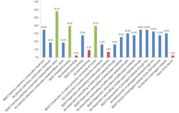 There were forty-nine responses to the survey and there were no observable multiple responses from any single institution. While this was a respectable number of survey responses, no exact response rate can be drawn from this total, as the number of institutions undertaking these practices is unknown. The respondents were predominantly preservation (65 percent) and conservation (23 percent) professional staff, with smaller representation from preservation (6 percent) and conservation (2 percent) support staff, as well as four percent collection management staff or librarians. Responses represented practices at a variety of institutions of different sizes and types. Seventy-one percent reported from research libraries, while 27 percent were from non-research institutions (though most were academic)—all from the US and Canada. The size of library collections served by the preservation programs was evenly distributed between the various size ranges (represented by volume count, a common statistic gathered by the ARL), with 21 percent under 1 million volumes; 27 percent at 1–3 million volumes;18 percent at 3–5 million volumes;16 percent at 5–8 million volumes, and 16 percent at over 8 million volumes.