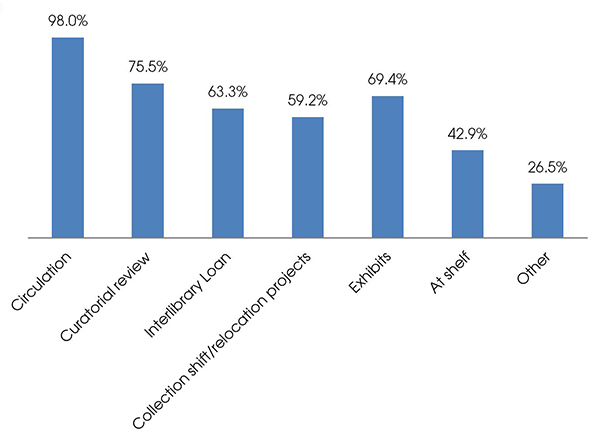 Not all workflows utilize input from such searches, so institutions were asked which preservation/conservation workflows warranted searching metrics. While responses varied widely, the three most common responses were for select general collections conservation treatment (58 percent), select pamphlet binding (39.5 percent), and select custom enclosures (39.5 percent) (see figure 3). When putting these responses into perspective with the common approaches to library preservation, the responses are not all surprising. General collections conservation is perhaps the area that this sort of searching is most likely to affect (and many institutions wrap pamphlet binding into the same workflows). Since general collections are likely to be more widely held and therefore more likely to have been digitized by a large-scale digitization effort and/or now available electronically, the impact of these metrics would be much higher in general collections than in special collections. Additionally, treatments that are more time intensive (higher-end general collections repairs and construction of custom enclosures) might be more likely targets to remove from workloads to save staff time for other treatments on less accessible materials. Lastly, enclosures might be a target for the application of such metrics as they are not a total solution to a condition problem on an item, but often the only option for items too brittle or damaged be successfully repaired, and thus still pose some access and use challenges, perhaps better solved by steering patrons to alternative resources for that content.