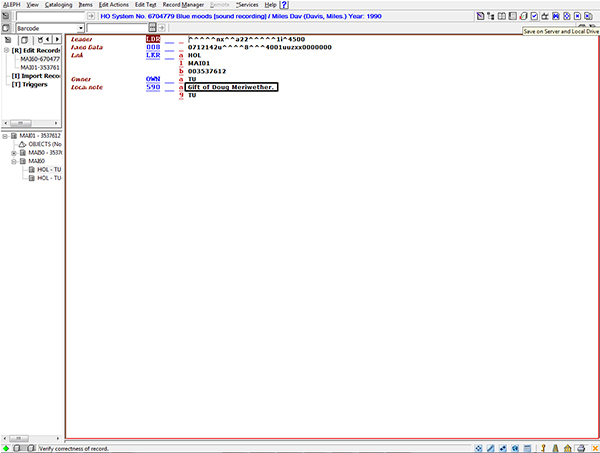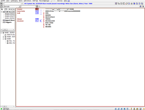 TU catalogers and the ITD project manager tested sample records from TLC and compared results. The first results were promising, as the records loaded properly, but several adjustments regarding holding and item information were required. To ensure proper mapping of data from TLC, the testers reviewed the sublibrary, collection code, item status, and material type that had been assigned in Aleph, and they analyzed the presence or absence of various local fields. One problem detected early in the process was that local notes were not being created as superholdings, and were being lost. Another issue was the inaccurate display of enumeration levels for serial and other multiple volume titles, which would later result in one of many clean-up projects. Because this problem was possibly due to inconsistency in the recording of the information rather than inaccurate display, clean-up was deferred until after the migration.