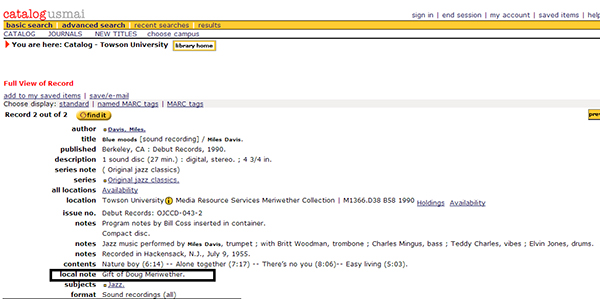 The retention of local, copy-specific bibliographic information was a consideration, and the unique implementation of local notes in the USMAI database requires a footnote in this narrative. Because the database represents the holdings of sixteen separate campuses, with a single bibliographic record shared by all campuses that own copies of the title represented by that record, it was necessary to indicate ownership of local bibliographic information by an individual campus. USMAI’s solution is to provide copy-specific information in a “superholding”—records attached to the shared bibliographic record (see figures 3, 4, 5).