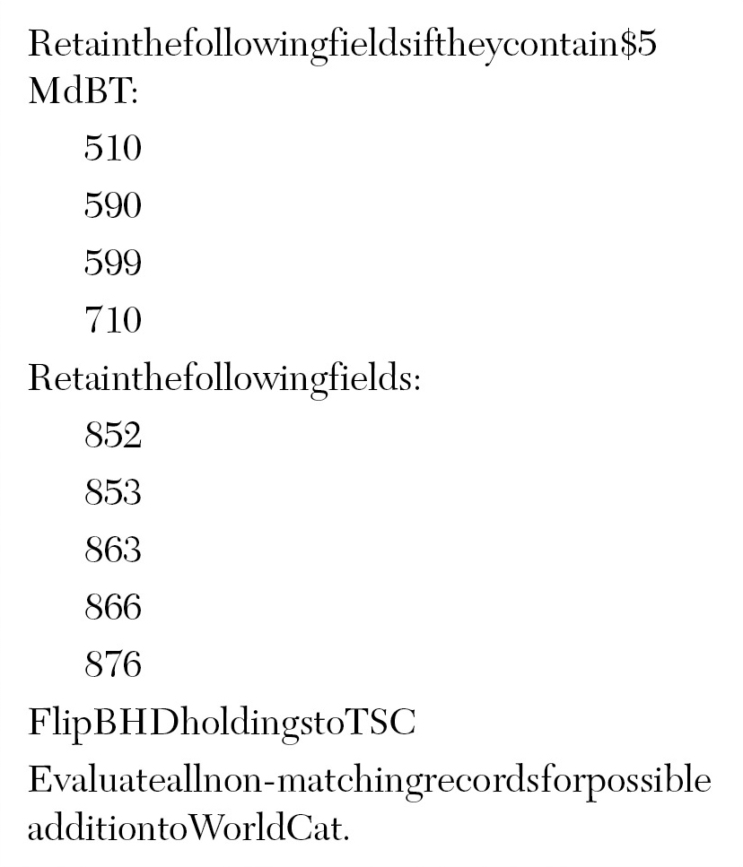 At this point, the author was brought into the process. She had been a librarian at BHU for many years and had joined the TU library six months previously. The author had served as BHU’s cataloger and was familiar with the original implementation of BHU’s ILS; she had worked with the vendor when the collection was converted to electronic form. The author had unique insight into the library’s s subcollections, holding codes, local bibliographic customizations, and the origin and significance of existing bibliographic decisions. Her institutional memory became very useful in the ensuing months. Another benefit of her presence was her relationship with her former BHU colleagues. The sharing of information pertinent to the merger of two databases flowed easily, a fact which would prove invaluable as the process progressed. Some of the files and documents that provided crucial information for the cataloging process had been written by the author. In addition, as a specialized Judaic collection, the BHU library contained a large number of materials published in foreign languages, primarily Hebrew and Yiddish. As the only Hebrew language specialist on the TU library staff, the author’s language skill was invaluable for identifying, testing, verifying, and planning for the future addition of these items.