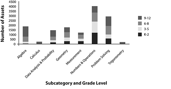 Assets were assigned to eight subcategories. Most asset records were assigned to Numbers and Operations with 4,031 (29 percent), followed by Problem Solving with 2,915 (21 percent) records Algebra with 1,875 (13 percent), Geometry with 1773 (12 percent), Data Analysis and Probability with 1,429 (10 percent), and Measurement with 1,217 (8 percent). The fewest records were assigned Calculus and Trigonometry accounted for 2 percent. Total percentages reflect rounding and asset assignment to multiple subcategories.