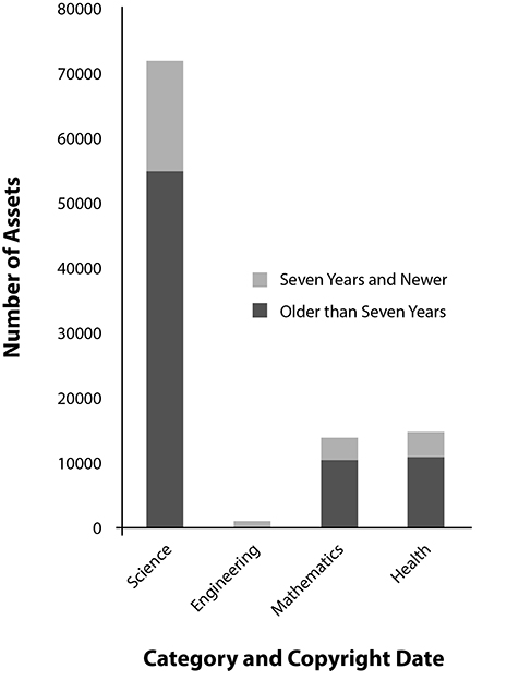 Figure 5 illustrates a comparison of copyright dates for all subject categories, which reflect that the majority (75,636 or 83 percent) of assets are older than seven years. As demonstrated by figure 5, science is the category with the most assets (71,702 or 71 percent) and most of the science assets (54,440 or 79 percent) are older than seven years. Health assets are the second largest STEM category with nearly 14 percent (14,603) and 73 percent (10,646) of those assets seven years or older. Math assets comprised almost another 14 percent (13,743) and 73 percent of them were older than seven years. The remaining 1 percent of assets related to engineering topics and 57 percent (340) had copyright dates older than 2003.