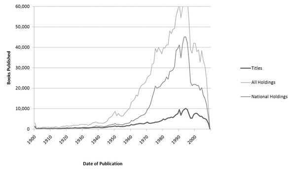 Globally and nationally, book publishing represents a central kind of cultural heritage. A number of bodies have found themselves jointly interested in any statistics to measure book publication as a measure of cultural diversity. The United Nations Educational, Scientific, and Cultural Organization (UNESCO) Institute for Statistics has been exploring library statistics for worldwide book consumption and helped found the European Expert Meeting on Book and Library Statistics.1 These bodies, as well as the International Federation of Library Associations (IFLA), are especially interested in any global patterns in the publication world as expressions of cultural diversity and heritage. Such data, however, are not widely collected by any national publishing organizations or library statistics agencies. The increasingly global reach of library records in the WorldCat database, on the other hand, makes it an obvious source for data mining. OCLC's bibliographic database represents more than 200 million items, with 1.6 billion copies held by libraries worldwide.2 It is well suited to serve as a global aggregate library collection, to be mined for data on national publication and library collection profiles.