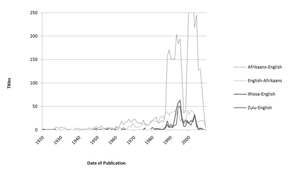 The data for the more culturally diverse country of South Africa, on the other hand, presents a much more varied tapestry of translation data, including translations between English, German, Afrikaans, and a number of tribal languages. Even more interesting historical patterns are revealed by plotting these data on a similar historical graph (figure 8). Whereas book publications from South Africa (figure 5) were more avidly collected after the 1959 deposit library system, the dominant type of translated works during the early decades of the Republic (1961 until the mid-1980s) are translations between English and Afrikaans, varying between around 25 and 150 per year. After the Zulu and Xhosa languages were decriminalized in 1991, however, translations from them enjoy a surge to more than 50 translations per year.