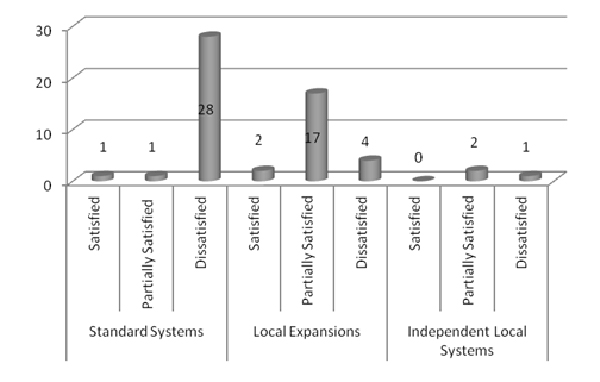 Interviewees were asked whether the classification systems in use were suitable for the organization of Islamic collection being acquired in the libraries and if the libraries were satisfied. Libraries’ level of satisfaction has been classified into three main categories: satisfied (the systems are optimally fulfilling the requirements), partially satisfied (the requirements are being fulfilled so far, but, for certain materials, systems is use do not have the options needed, and unsatisfied (the available systems do not fulfil the requirements and present numerous problems and shortcomings when classifying materials on Islam). Only 1 library was satisfied with standard classification systems and 1 was partially satisfied. None of the 3 users of independent local schemes on Islam were satisfied; 2 were partially satisfied. Two out of 23 libraries using local expansions were satisfied and 17 were partially satisfied. Figure 3 shows the level of satisfaction with classification systems currently in use.