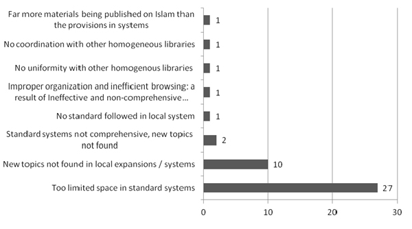 The empirical data taken through the interviews shows a gloomy situation regarding the classification practices and usage of classification systems to organize the Islamic knowledge in the libraries that have rich collections on Islam. Neither the standard classification systems nor local expansions or schemes are fulfilling the purpose. The reasons behind this problem could be the background of the devisers of the standard classification systems. Perhaps they were unaware of the length and breadth of the expansion of Islamic knowledge and the variety of topics and materials being produced. Second, perhaps they did realize that their systems could spread around the globe and that a range of the libraries throughout the world would be using these schemes at some point. Their personal interest and biases also may be among the reasons. Once they formed the basic structure of their schemes, drastic changes in the design, structure, and format of these systems was very difficult. In response to these problems, different practices have been adopted. Sometimes libraries developed their own systems without following or developing any standards. Some libraries developed expansions in the standard systems. Efforts were made to get these expansions formally incorporated in the original schemes, but such efforts have not yet succeeded. Libraries have taken very different approaches in the expansions of even the same standard systems and no uniformity is found. Thus the same kind of knowledge is organized differently at different places.