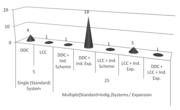 Three different independent local schemes are being used for Islam. Five groups of libraries were using the same classification systems and their expansions. One group consisted of 5 libraries and the other 4 groups consisted of 3 libraries each. Only 2 of these 5 groups had coordination between the members. Figure 2 presents a summary of the classification systems in use by the sampled libraries.