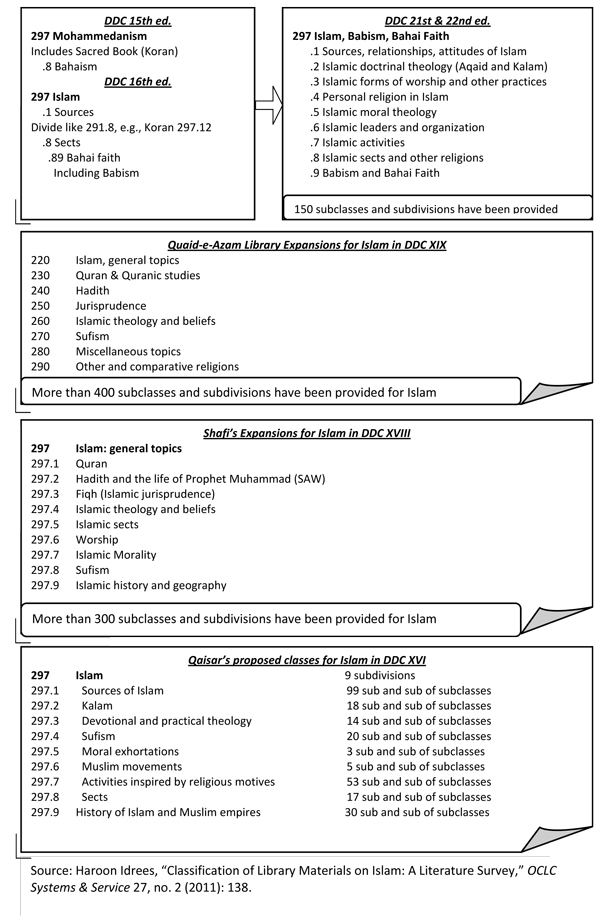 According to Riazuddin, the devisors of all standard classification systems were from western parts of the world, except Ranganathan, who was from India but was not a Muslim.5 The environment of the devisors and their interests were the probable reasons that all these systems lacked attention to eastern areas of knowledge, especially Islam in the class of religions. DDC, which is the most popular standard classification system in the libraries of the east, provided only one of one thousand notations in the third summary. This was quite insufficient. Subsequently, many expansions were made in DDC to provide adequate placement for collections on Islam. These expansions were made either within the given space (i.e., notation 297) or alternatively utilizing the notations that were originally provided for Christianity.