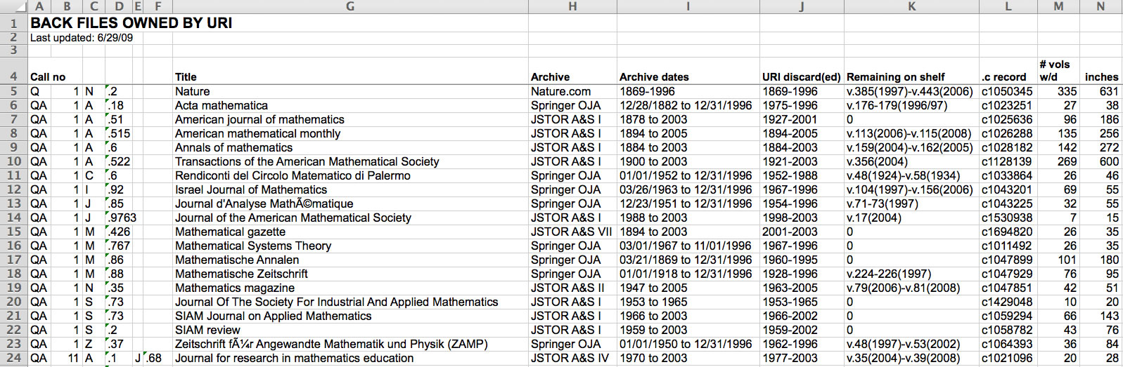 The head of Acquisitions merged the titles and holdings downloaded from Serials Solutions into a single spreadsheet that contained journal titles, names of online archives, and dates of coverage. She added blank columns for call number, years to discard, volumes and years remaining on shelf, library system record number, number of volumes withdrawn, and number of inches withdrawn.