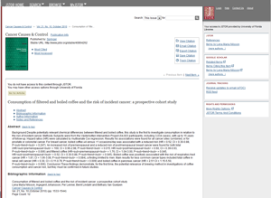 Nilsson, Lena Maria, Ingegerd Johansson, Per Lenner, Bernt Lindahl and Bethany Van Guelpen “Consumption of filtered and boiled coffee and the risk of incident cancer: a prospective cohort study” Cancer Causes & Control, 21.10 (2010): 1533–1544. Web. 22 Apr. 2013