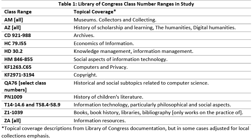 Within these disciplinary studies, LIS is usually treated as equivalent to the LC “Z” class range or grouped with several other class ranges into a set of “other” titles. Levine-Clark’s global EBL and ebrary use analysis grouped Z, A, and G class ranges into such an “Other” category, effectively excluding them from parts of his analysis related to percentage of titles used. However, he includes all classes in his breakdown of intensive and extensive use: for EBL, Z titles performed on par in terms of number of titles used but saw more extensive than average use of copies and downloads, and lower than average use of views and prints; in ebrary, Z overperformed in terms of number of titles used, but had lower-than extensive use for all use types except downloads, which exceeded the norm. Analyses of Z titles have diverged otherwise. Linden, Sidman, and Tudesco showed underperformance by Z titles relative to the overall collection, but Knowlton showed approximately even use of Z e-books relative to the overall collection and a preference for e-books over print books for Z titles.14 Sprague and Hunter showed use of under 20 percent of Z titles in an early study.15 More recently, Mays demonstrated low levels of both “grazing” (short-term loans) and purchasing of e-books in a PDA program for Z titles, but her analysis is limited to raw totals and not relative use compared to presence in the collection.16 Regardless of findings, these studies all treat Z as equivalent to library science (or bibliography). This poses problems for understanding LIS collections both because the Z class range is split between LIS content areas and bibliographies for other disciplines, and because LIS content exists in a variety of other class ranges as a highly interdisciplinary subject area.