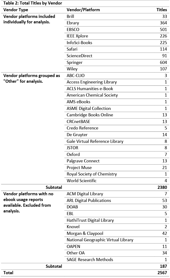 The resulting data set included 2,567 e-books (with duplicate titles from different vendors counted distinctly). Some books had no usage data available either because they were open access titles or because the vendor did not provide usable usage reports. For example, Morgan & Claypool’s Synthesis Lectures e-book series include reports in the COUNTER Journal Report 1 format, which aggregates all titles into a single line of reporting for each series, instead of Book Report 1. Titles from vendors with no available data were removed from the data set for analysis, resulting in a final data set of 2,380 e-books (a reduction of 7.28 percent). Table 2 shows the number of titles for each vendor, distinguishing those vendors included and excluded from final analysis.