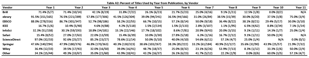 Figure 4 shows percentage of titles used in their initial year of publication and in subsequent years. It reveals an overall decline in percentage of titles used as they age. Notably, an extremely high percentage of title-by-title purchases are used in their first two years of publication from the two primary vendors for such purchases in LIS, ebrary, and EBSCO, and, to a lesser extent, with Brill. Titles from one e-book bundle, ScienceDirect, perform especially well in this period (although the number of LIS titles in this collection is much smaller than ebrary or EBSCO, and numbers for ScienceDirect may be inflated due to missing reports for some titles that are difficult to interpret since ScienceDirect provides zero-use titles in their reports). Titles from another e-book bundle, Springer, shows about half of LIS-related titles used in their first year (if the missing ScienceDirect titles are counted as zeros, it also runs at about half of titles used). Looking at the year of publication, the percentage of e-books owned and used in their first year has grown substantially from 46 percent (for 2012 titles) to 79 percent (for 2016 titles). In general, e-books in LIS show surprising staying power, with over 27.6 percent of all titles owned continuing to be used as far as eleven years after publication. This provides a very different picture of LIS e-book use than previous studies and demonstrates little evidence of problems with marketing and awareness of e-books that others have considered as the source low usage statistics in prior studies.