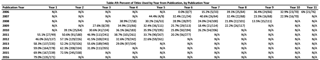 Figure 11. Percent of Titles Used by Year from Publication, by Publication Year