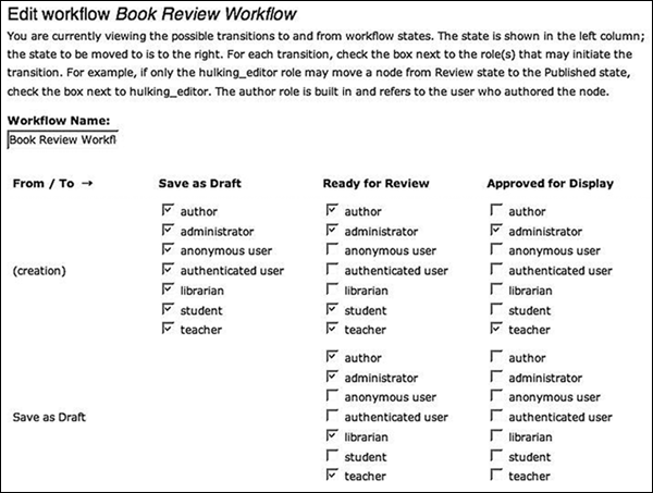 Drupal has a very basic but powerful work flow built in with the node's publishing options. But if you need to add more layers to your work-flow process, you will want the Workflow module. Designed for online newspaper sites, the Workflow module is flexible enough to fit a wide variety of workplace settings. We are using it to provide a higher level of moderation to prevent any student-created content from going live on a site before it is approved by a librarian (see figure 24).