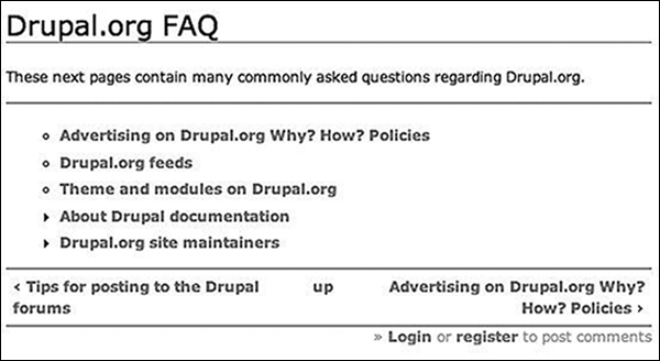 The Book module does not let you add information about a book, but it is used to group together a series of page nodes into a larger hierarchal node like chapters in a book. Pairing this with Drupal's revision control system is Drupal's answer to a wiki. While not quite a wiki, it provides a very powerful way for a community to co-author a Web document (see figure 20)