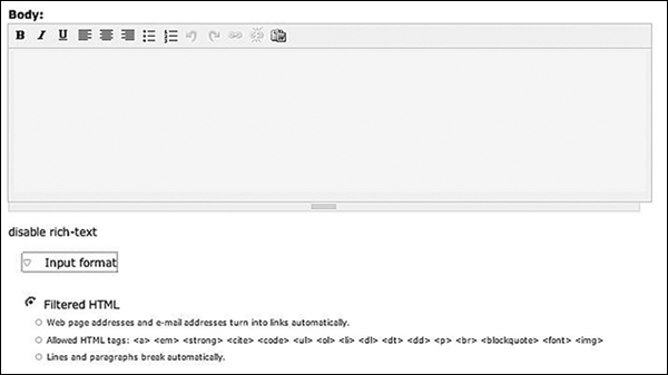 A final module type that must be considered are those that provide WYSIWYG editing. There are ongoing discussions within the Drupal community about the inclusion of WYSIWYG modules; some see them as a potential security risk, while others tout the usability factors.1 There will be more conversation and development, but for now our recommendation is to use one of the WYSIWYG editing options. By setting up a very lightweight set of buttons in the editor we use, TinyMCE, we have been able to maintain the security of the site while also providing users with a more familiar text-editing environment (see figure 25)