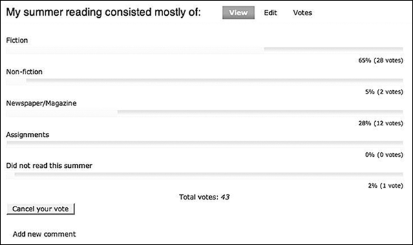 The Poll module provides an interface for asking a question with a number of possible answers. Additional code in the module manages the full poll experience, including restricting potential voters from seeing the results until after they submit their vote. Administrative controls allow you to set options, including whether or not users can change their votes and deciding who can see the way different users voted. The Poll module also enables a special block that displays the latest poll. Libraries could use polls on their site to garner feedback about new programs or to give users a chance to interact by voting for a favorite book character (see figure 21)