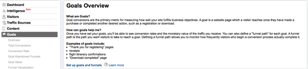 One of the most important things you can do when planning for website analysis, both from a big-picture, organizational perspective and from the perspective of your website's specific role within the library, is to set goals. You do this first conceptually, based on your library's mission, and then technically within GA.