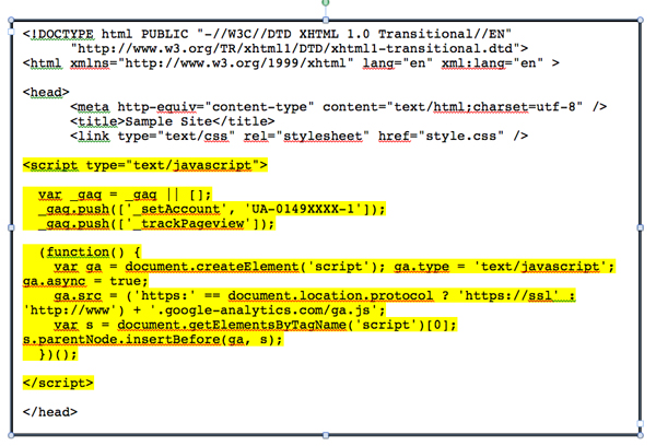 Currently, the recommendation is to place the GATC immediately before the </head> tag (figure 5). This is called the asynchronous snippet.