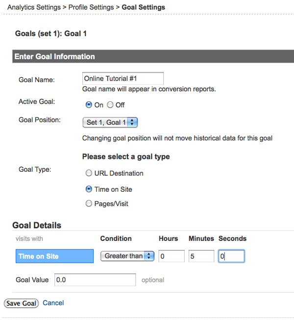 Add a goal title. Then select the type of goal from URL Destination, Time on Site, or Pages/Visit. The URL Destination goal would be used when you are shooting for a higher number of visits for the director's blog. The Pages/Visits would be a goal where you would like to go over a certain number of pages viewed per visit, so 15 might be an appropriate threshold for this category. In the example in figure 10, I have used Time on Site as a goal for the online instruction session, with a five-minute time threshold. (I'm assuming the instruction videos are five minutes long.) I selected Time on Site rather than URL Destination because I don't want to know just that the students are going to the page, but rather that they are viewing the entire tutorial. (For information about tracking use of Shockwave/Flash tutorials, see chapter 4.)