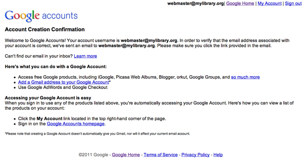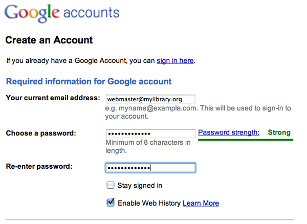 When you register with GA, you can use any e-mail address. Keep in mind that the e-mail account you use for you library's Google account registration becomes the login that you use to register for GA and will then be associated with your library's analytics account and the reports. Thus, for this purpose use an e-mail account specifically associated with your library rather than your personal account. In my example, I use webmaster@mylibrarary.org (see figures 1 and 2). You are, of course, still free to create additional personal and professional accounts with Google.