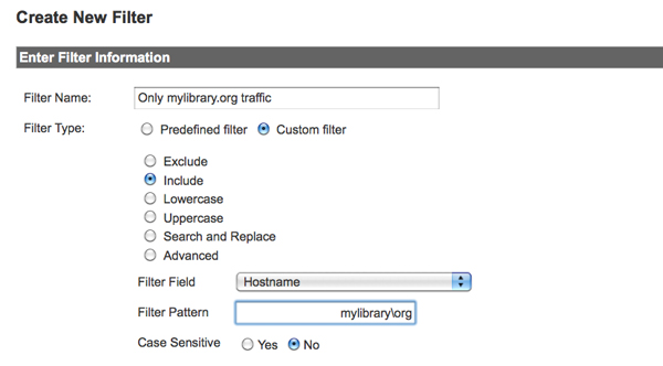 Brian Clifton lists two common profile filters that are relevant to libraries:8