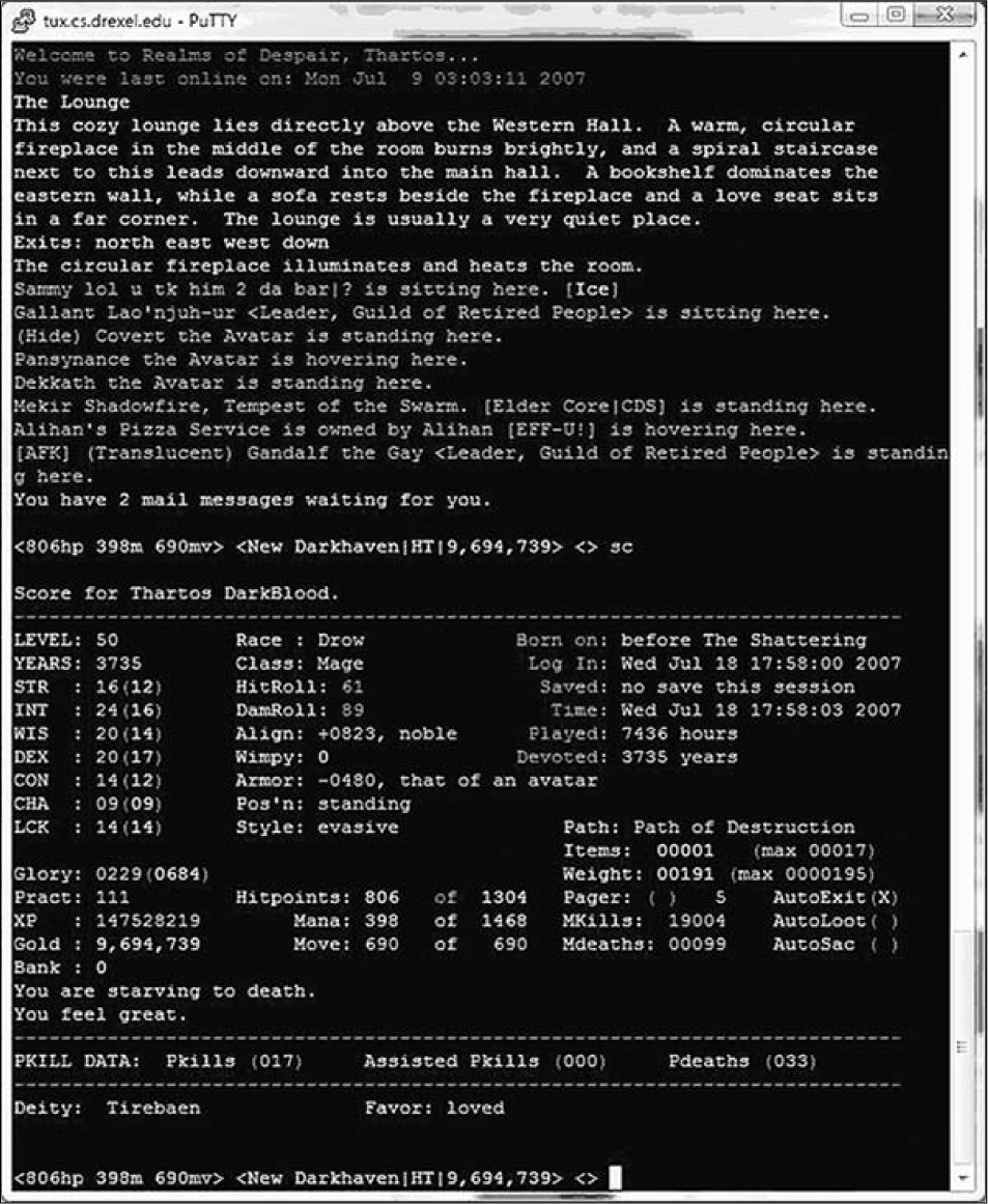 Virtual worlds are an evolution of computer programs that were first known as MUDs (figure 1). Dating back to 1979, the first MUDs were text-based, and the interactions, environments, and communication all occurred without graphics. These words were used to describe encounters between the user or player and the virtual world: