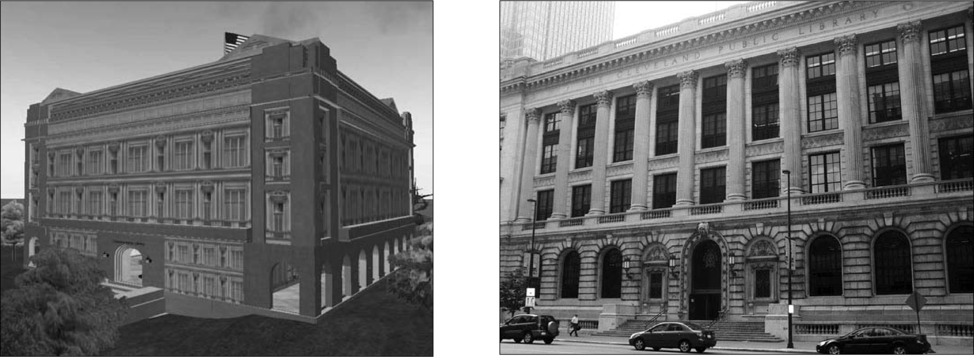 The virtual (left) and the brick-and-mortar (right) main buildings of the Cleveland Public Library. |