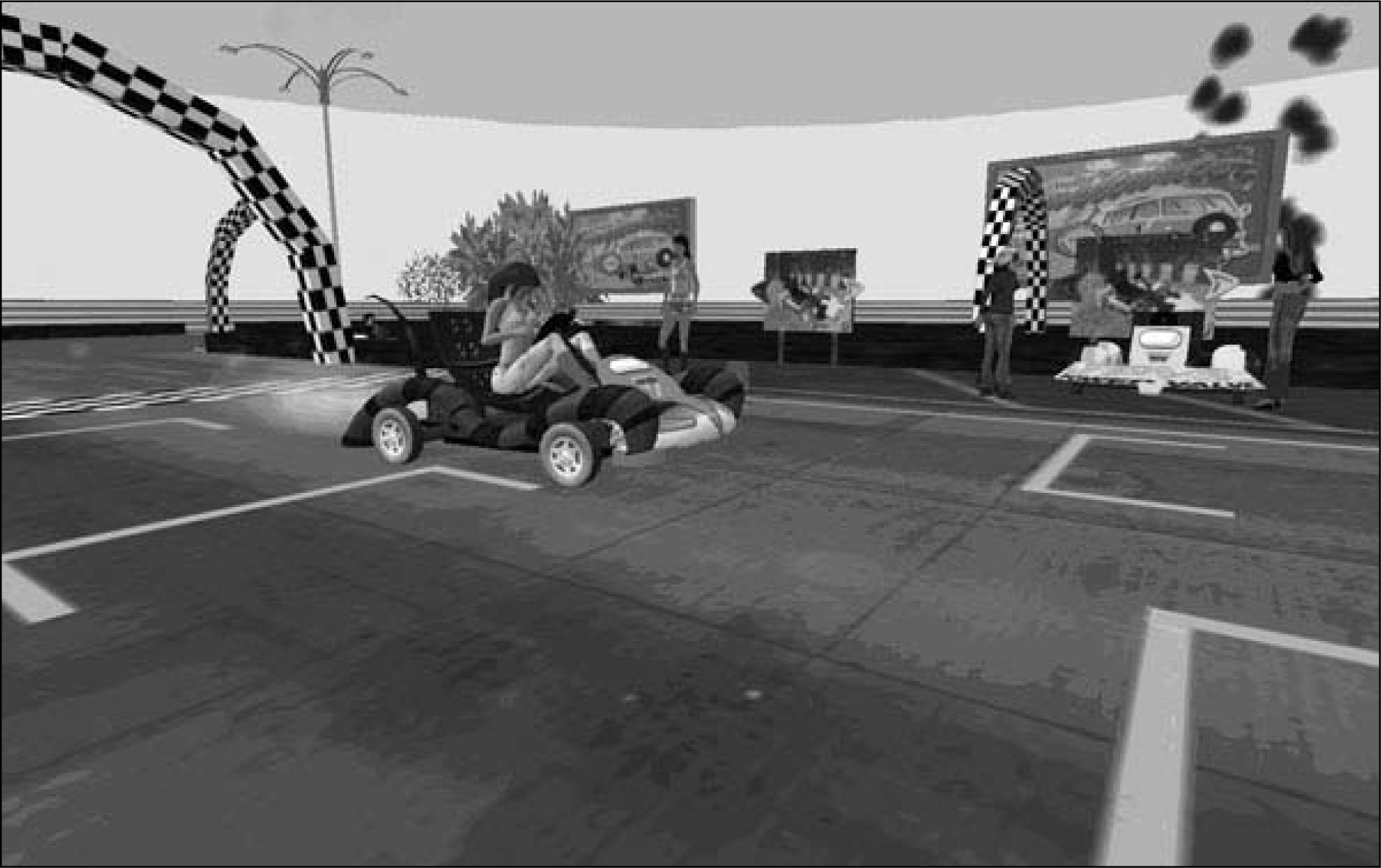 Based on the user experience reported by students in this focus group, I have designed Second Life activities that place creativity and play at the center. When I orient students to Second Life, I build a carnival or a tropical beach resort, and I let students discover the Second Life interface through play. For example, if I'm using a carnival theme, students learn avatar controls by riding go-carts, playing soccer, or playing carnival games (see figure 14). They learn how to attach objects to their avatar by winning prizes such as glow sticks or by visiting concession booths to get free slices of pizza. I use this method as opposed to the typical tutorial or instructor-led, step-by-step instruction currently used by most Second Life instructors. Along with creativity, I also emphasize the social element of Second Life by creating group activities and projects.