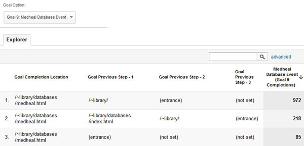 | 65% or more of the users that accessed the library’s databases did so in three clicks or less. | Conversion is the Event Goal Type with a custom segment (viewed three web pages or less before exiting site). |