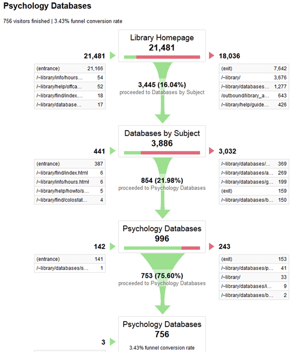 If a funnel is properly implemented, this report shows you where website users enter your site and the pages they access to reach the goal page. Funnels are useful because they show where users abandon the process before reaching the goal page. This can help pinpoint potential problems with the site leading users to that goal page. Figure 6.2 shows a funnel for the goal to get website users to the psychology databases. The funnel was set to start tracking from the library’s home page. Over 21,000 visits took place on the home page, but only 3,445 visits continued to the Databases by Subject web page, which is the next page required in the steps to access the psychology databases. From there, fewer users selected to go to the Psychology Databases web page and even fewer actually ended their visit to the library’s website by clicking on a psychology database link. This really is not too surprising since the library has numerous databases available in other subject areas and not every single visitor to the library’s website wants to use a psychology database. However, it does show some interesting findings, including that roughly 25 percent of the visitors who are on the Psychology Databases web page do not click on a psychology database and end up going to a different section of the website or just leave the site!